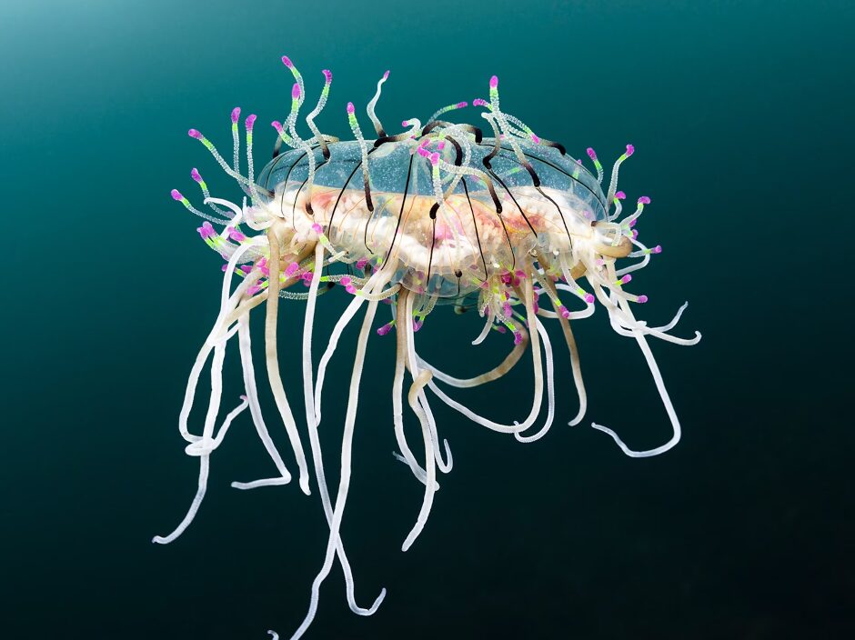 Најчесто се среќава крај Јапонија, Бразил и Аргентина, а изгледа како подводен букет. Нејзините шарени пипала ги парализираат малите риби со убод, а потоа ги вовлекува во проѕирното тело. Иако нејзиниот отров не е смртоносен за луѓето, убодот е болен и остава црвенило.