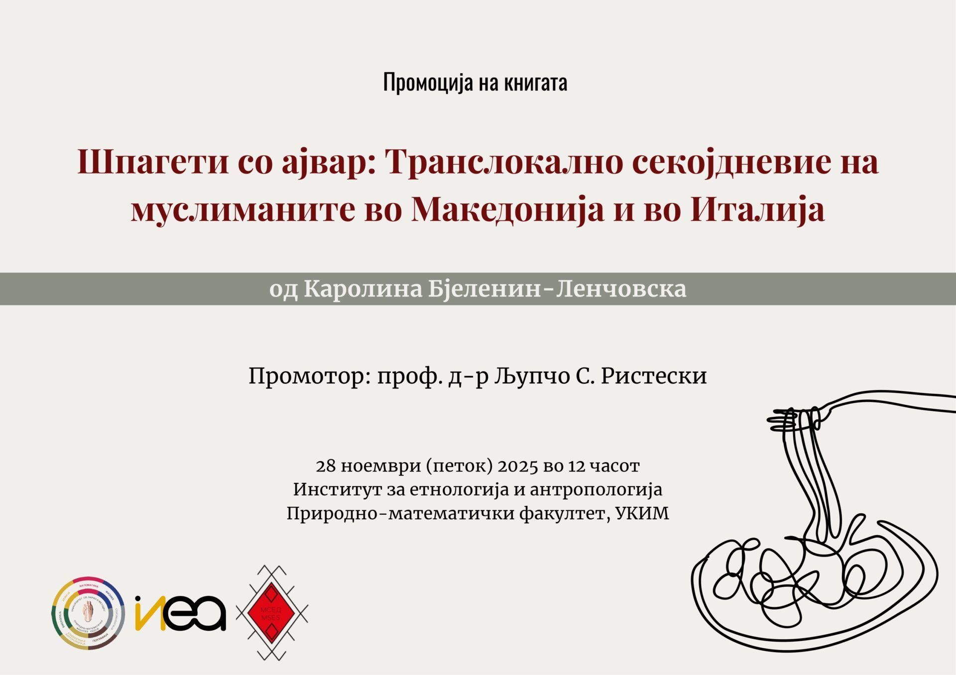 Во петок, 28.11.2025 во 12 часот во просториите на Институтот за етнологија и антропологија (Природно-математички факултет, долна зграда), ќе се одржи промоција на ново издание од областа на етнологијата и антропологијата, под наслов „Шпагети и ајвар: транслокално секојдневие на муслиманите во Македонија и Италија“. Тоа беше објавено на полски јазик во 2015 година, а сега излегува и во превод на македонски на самата авторка. Уредник на изданието е на проф. д-р Ана Ашталковска Гајтаноска, a издавач е Македонското студентско етнолошко друштво (МСЕД). Промотор ќе биде проф. д-р Љупчо Ристeски.