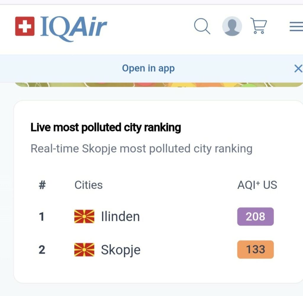 Според светскиот сервис IqAir Скопје утрово е на 20 место во светот и на второ во Европа по загаденост.
