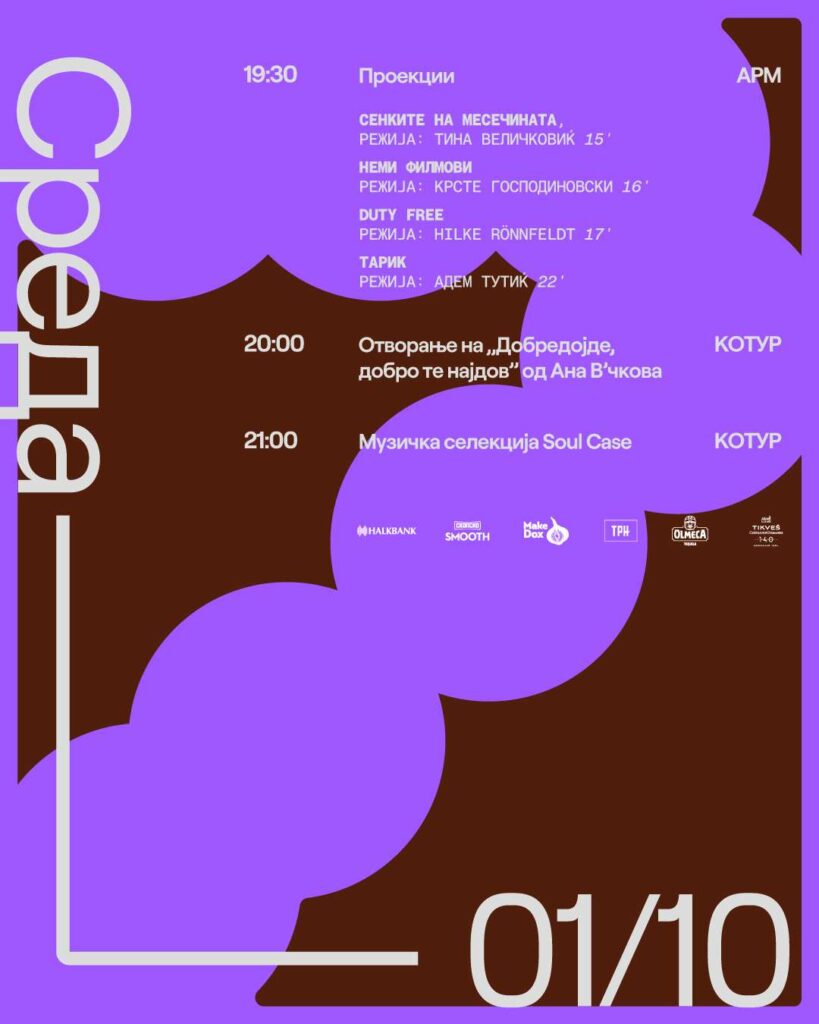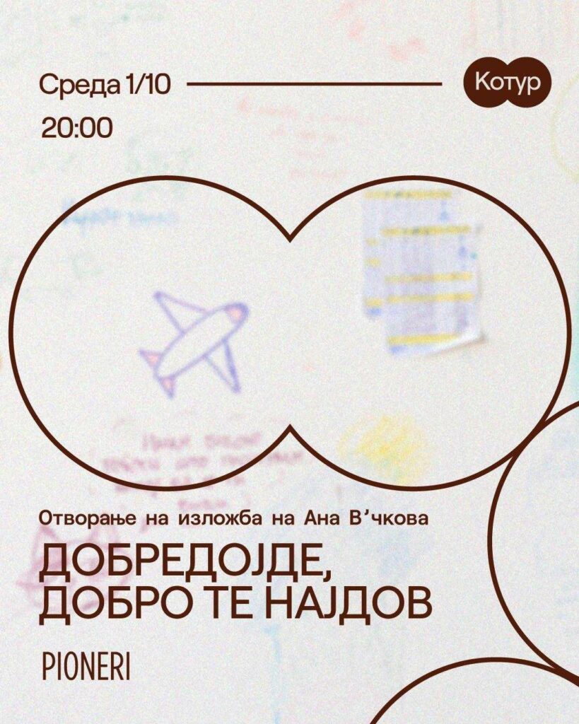 Во КОТУР ќе биде отворена изложбата на Ана В’чкова – „Добредојде, добро те најдов“, реализирана во соработка со Pioneri Art Platform. Делото ги истражува границите помеѓу интимното и колективното преку мултисензорно и интерактивно уметничко искуство. Посетителите се охрабрени да донесат лични предмети – фотографија, спомен или порака – и да станат соавтори во создавање на колективна урбана нарација.