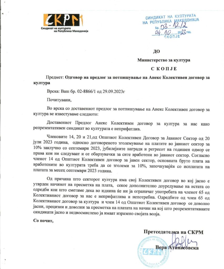 Синдикатот на културата на Република Македонија (СКРМ) реагираше на упатството за пресметка на платите во културните установи, донесено од Министерството за култура, оценувајќи дека тоа е спротивно на Колективниот договор и на важечките законски одредби.