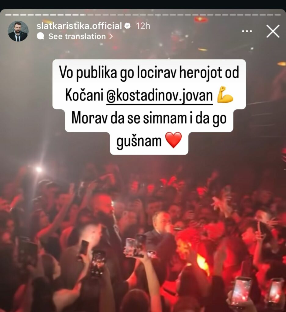Вчерашниот настап на Слаткаристика во Станица 26 донесе еден од оние моменти што ја надминуваат музиката и стануваат лична, колективна емоција. Меѓу присутните беше и Јован Костадинов – младиот човек од Кочани кој стана симбол на храброст откако спаси 21 живот во трагичниот пожар што го потресе градот. Кога Слаткар го забележа во публиката, веднаш се симна од сцената, го прегрна и му оддаде почит пред сите присутни.