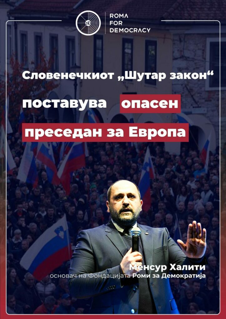 Брисел, 18 ноември 2025 година – Ромската фондација за Европа изразува длабока загриженост по усвојувањето на таканаречениот „Шутар закон“ од страна на навионалното собрание на Словенија. Словенија направи нешто што Европа ретко признава дека се случува во рамките на Унијата: донесе закон со кој целото малцинство се третира како безбедносна закана. Дозволувајќи влез без налози по домовите, проширени овластувања за надзор и и ангажирате на војската во домашното полициско работење, законодавството означува длабока промена во начинот на кој една земја-членка на ЕУ ја дефинира безбедноста во сопствените граници.