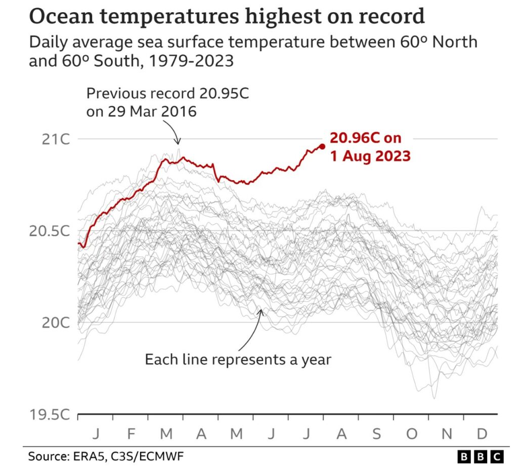 Соборениот температурен рекорд следи по серијата топлотни бранови во морето оваа година, вклучително и во Обединетото Кралство, Северен Атлантик, Медитеранот и Мексиканскиот Залив.