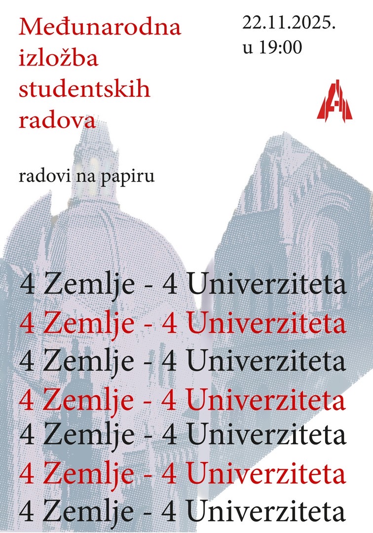 Денеска, 22 ноември 2025 година, во Галеријата на Академијата за ликовни уметности во Сараево, со почеток во 19 часот ќе биде отворена меѓународната изложба „4 Земји 4 Универзитети”. На изложбата ќе бидат изложени осумдесетина дела на хартија (графики, цртежи, колажи и плакати), а со свои дела учествуваат и 20-тина студенти од Факултетот за ликовни уметности при УКИМ во Скопје.