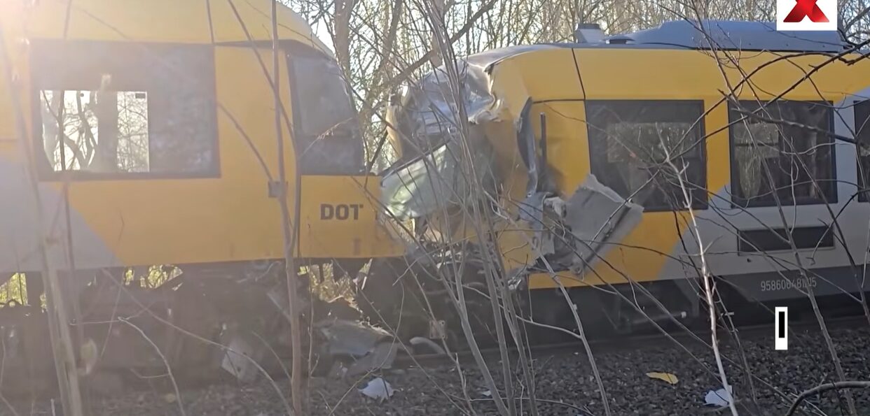 Јавниот радиодифузен сервис DR прикажа снимки од два жолто-сиви воза, при што двата со видливи оштетувања на предната страна, како стојат еден спроти друг во шумска област.