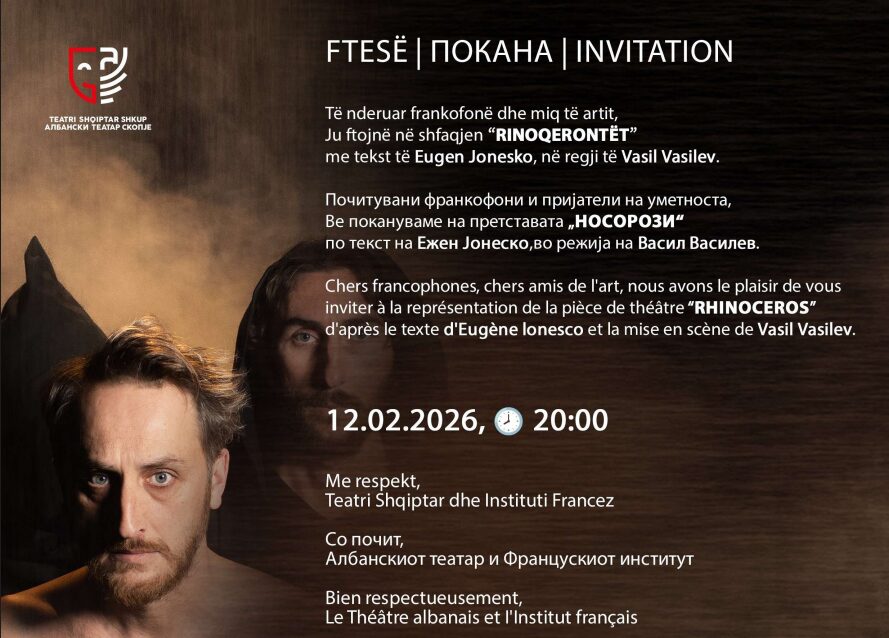 Албанскиот театар – Скопје, во соработка со Францускиот институт во Скопје, ја организираат театарската претстава „Носорози” од Ежен Јонеско, која ќе се одржи во четврток, 12 февруари 2026 година, со почеток во 20:00 часот, во Албанскиот театар – Скопје.