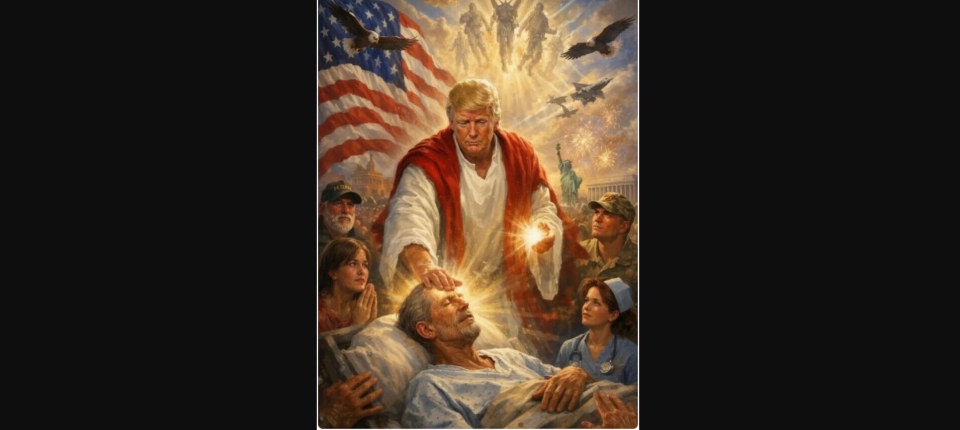 Сликата предизвика реакции и кај дел од религиозните конзервативци, кои вообичаено се меѓу неговите најлојални поддржувачи. На неа Трамп е прикажан во бела мантија, со светлина околу телото и со рака поставена врз човек што лежи, додека во позадина се гледаат симболи како Статуата на слободата, орли, огномет, војник и медицинска сестра.