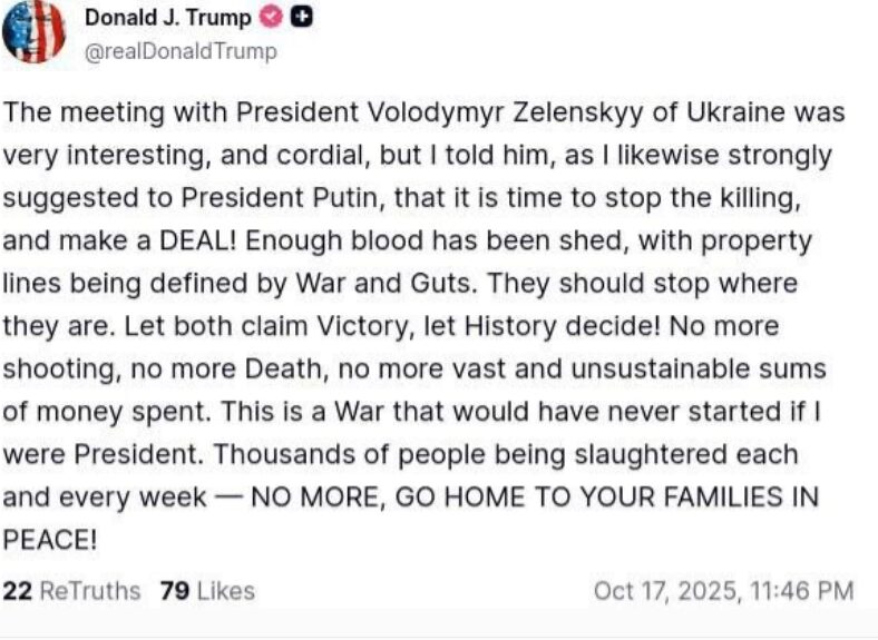 Во изјавата на својата платформа Truth Social, Трамп напиша дека разговорот со Зеленски бил „многу интересен и срдачен“, додавајќи дека му порачал, како и на Путин, дека „време е да се сопре крвопролевањето и да се постигне договор“. „Доста е со смртта и уништувањето. Нека и Зеленски и Путин прогласат победа, а историјата нека одлучи. Време е сите да се вратат дома во мир,“ напиша американскиот претседател.