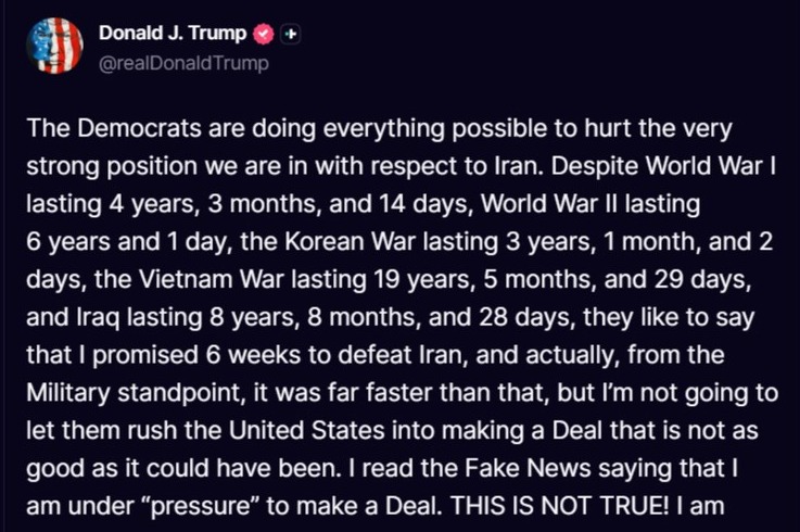 Во истата порака, Трамп направи споредба со времетраењето на Првата и Втората светска војна, Корејската војна, Виетнамската војна и војната во Ирак, обидувајќи се да покаже дека ваквите конфликти и преговори не се решаваат под диктат на кратки рокови. Според него, критиките дека ветил брза победа или брз расплет се неточни и политички мотивирани.