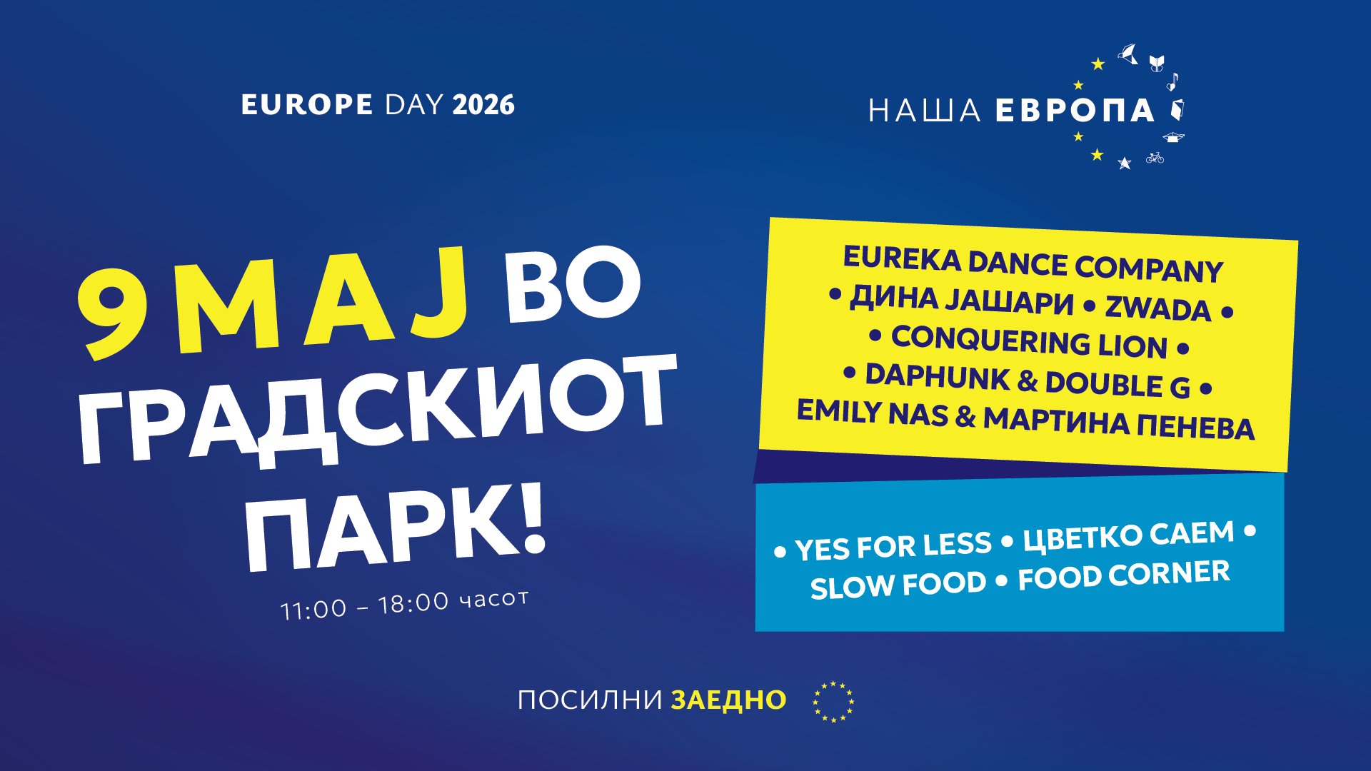 На 9 мај, по повод Ден на Европа, во Градскиoт парк во Скопје ќе се одржи настан под мотото „Уживај ја Европа“, со повеќе тематски зони наменети за различни генерации посетители.