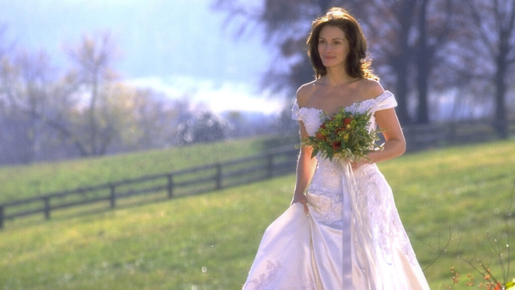 Деведесеттите ѝ подарија на публиката нови венчални архетипови. Во Four Weddings and a Funeral (1994), фустанот на Енди Мекдауел беше елегантен, минималистички и ослободен од драматичност – одраз на урбаниот реализам на новата љубов. Во Runaway Bride (1999), Џулија Робертс низ повеќе фустани ја одигра метафората на жена која бега не од љубовта, туку од сопствените стравови. Фустанот на Vera Wang од последната сцена стана икона на модерната невеста – едноставна, но со сила на одлука.