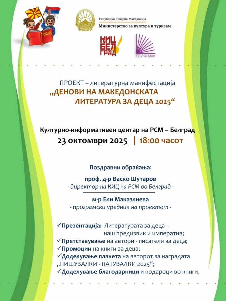 Во просториите на Културно-информативниот центар на Република Северна Македонија во Белград вчера започна литературната манифестација „Денови на македонската литература за деца 2025“, која ќе трае до сабота. Настанот, организиран од издавачката куќа „Едука Мак“, има за цел да ја промовира современата македонска литература за најмладите и да ја зајакне културната соработка меѓу Македонија и Србија.