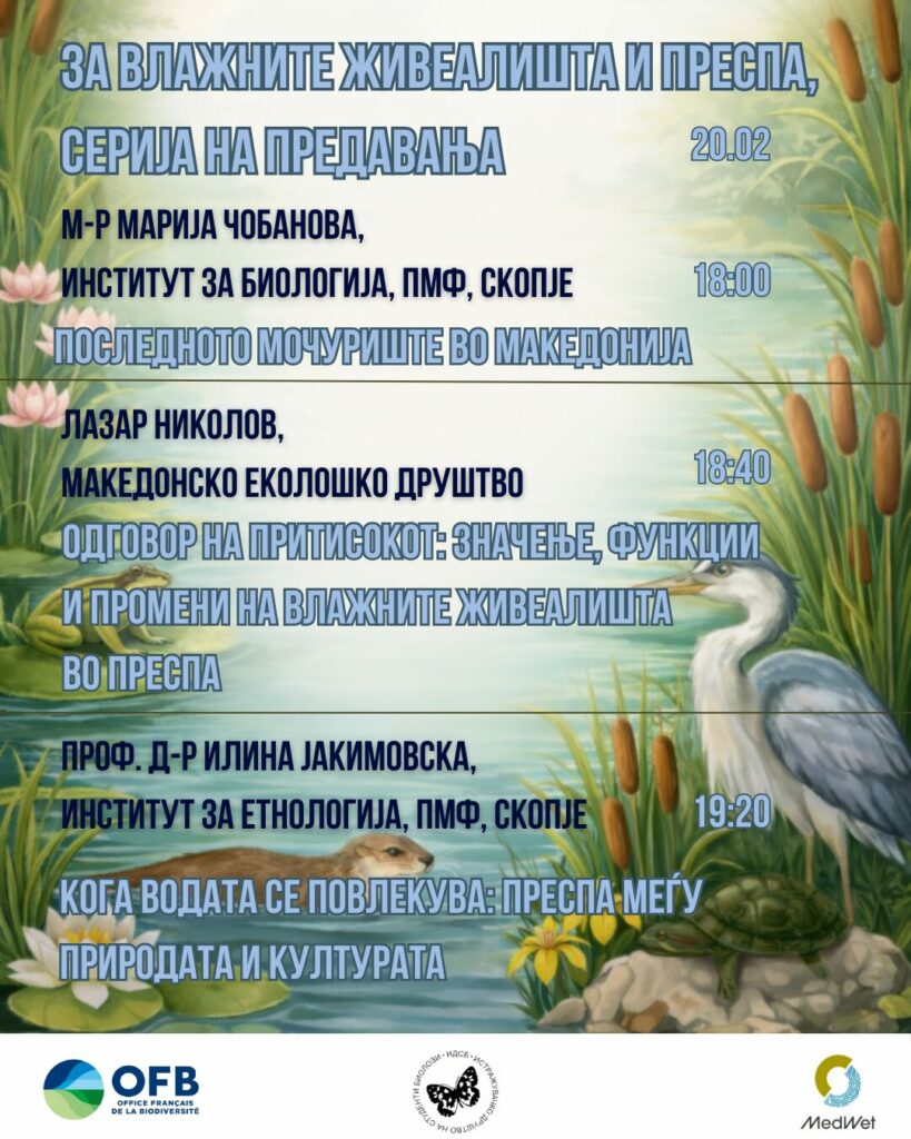 М-р Марија Чобанова ќе говори на тема „Последното мочуриште во Македонија“, Лазар Николов ќе одржи предавање со наслов „Одговор на притисокот: значење, функции и промени на влажните живеалишта во Преспа“, додека проф. д-р Илина Јакимовска ќе се осврне на темата „Кога водата се повлекува: Преспа меѓу природата и културата“.