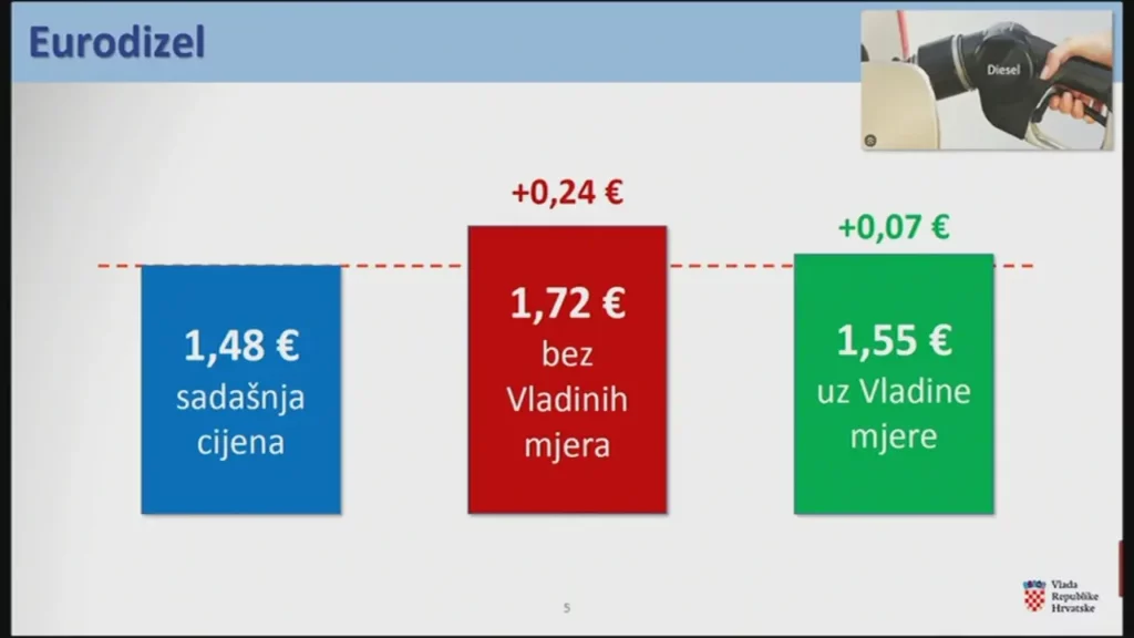 На седницата во понеделник, владата повторно воведе регулирање на максималната малопродажна цена на горивата, така што почнувајќи од вторник, 10 март, и во следните две недели, основниот бензин ќе биде поскап за четири центи, а дизелот за седум центи по литар, објави јавниот хрватски сервис ХРТ.