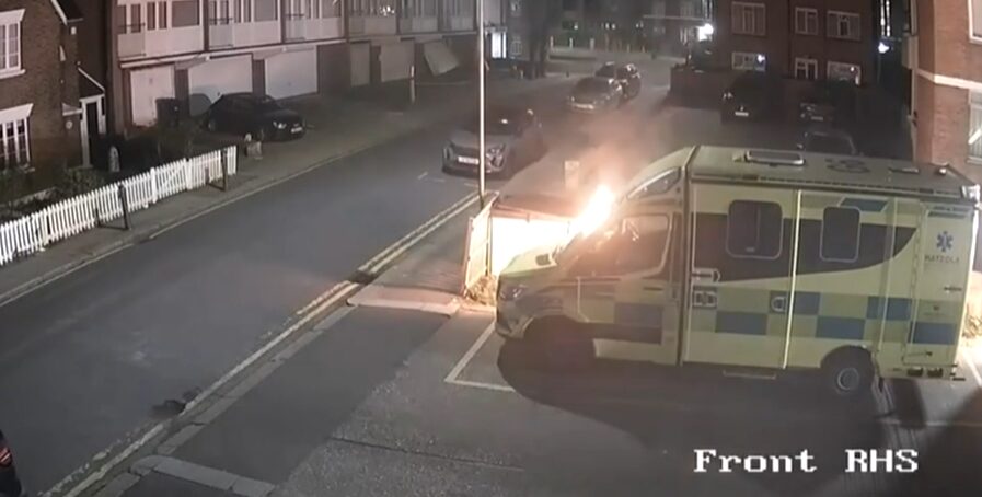 Снимките од безбедносните камери се прикажани како тројца осомничени облечени во црно одат кон амбулантно возило пред да го запалат.